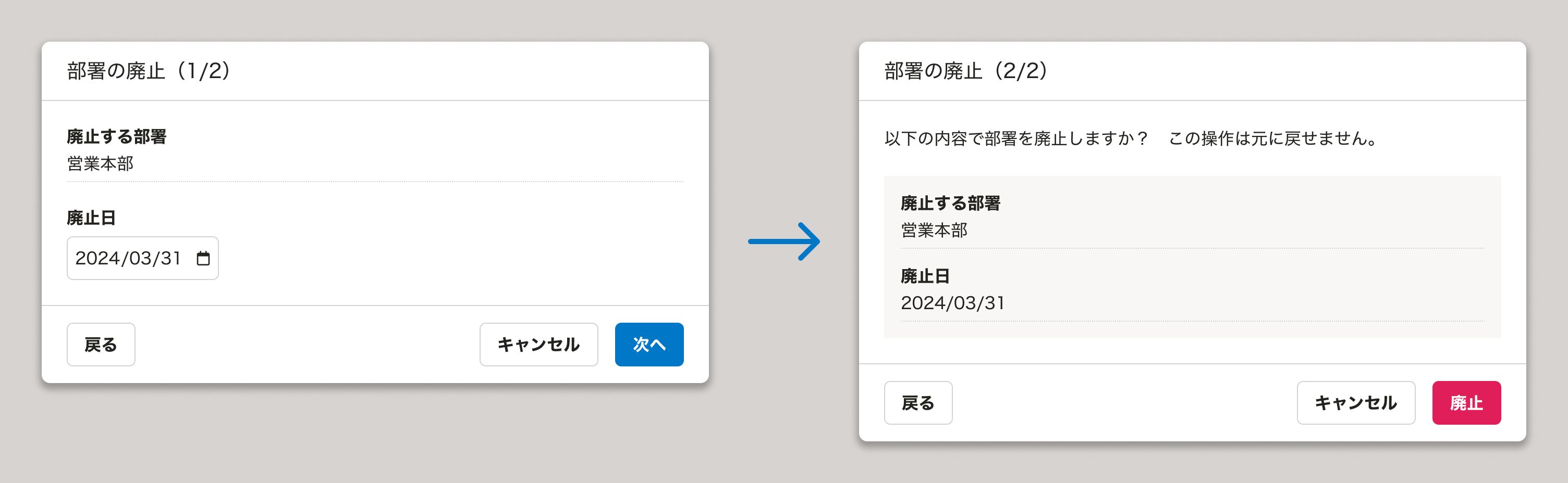 ワンクッション必要な操作は実行前に確認のダイアログを表示しますが、この際にあわせて何らかのパラメーターの入力を伴う場合、「パラメーターを入力するステップ」と「確認のためのステップ」で構成されたウィザードを採用することがあります。